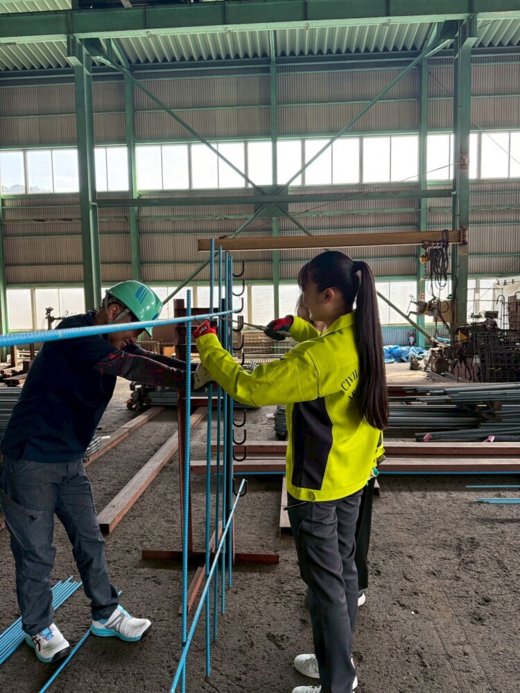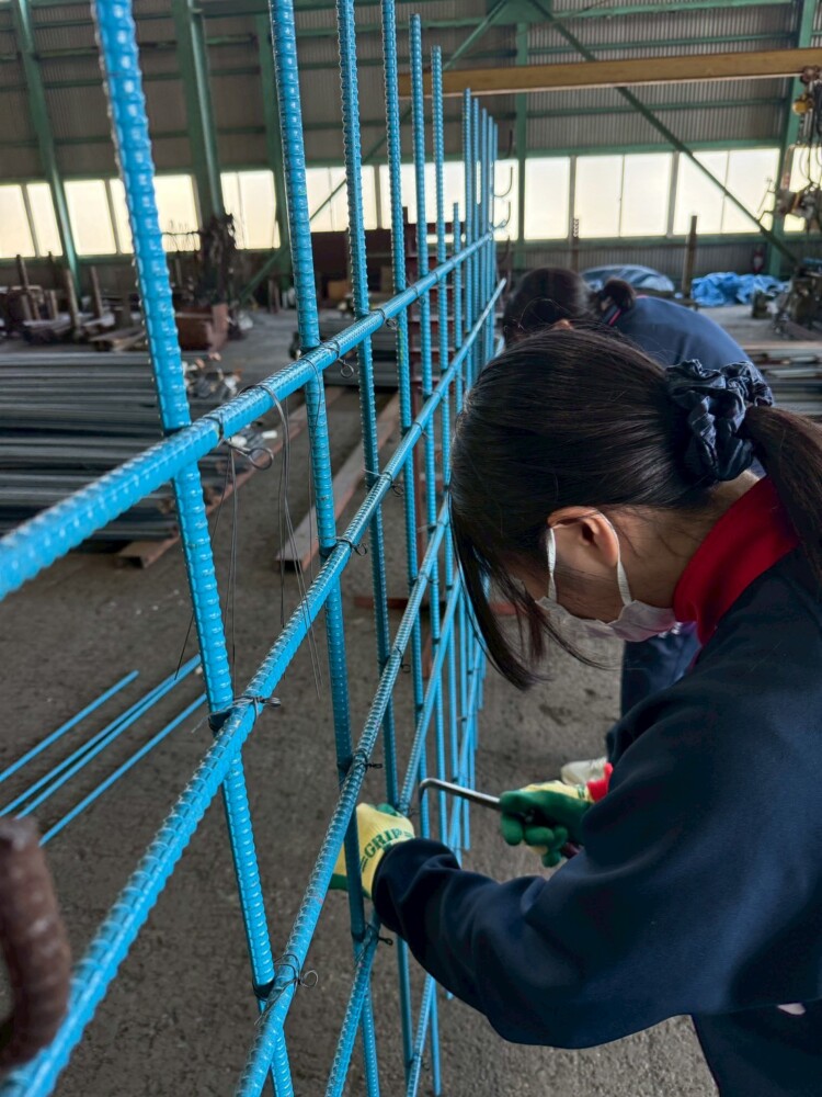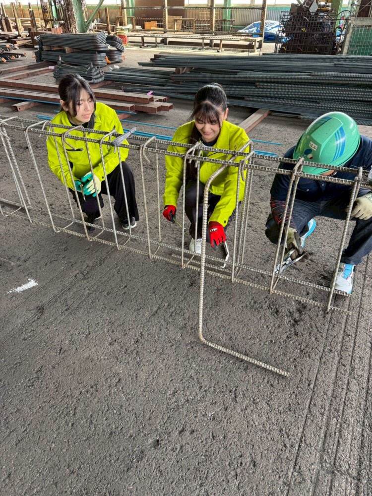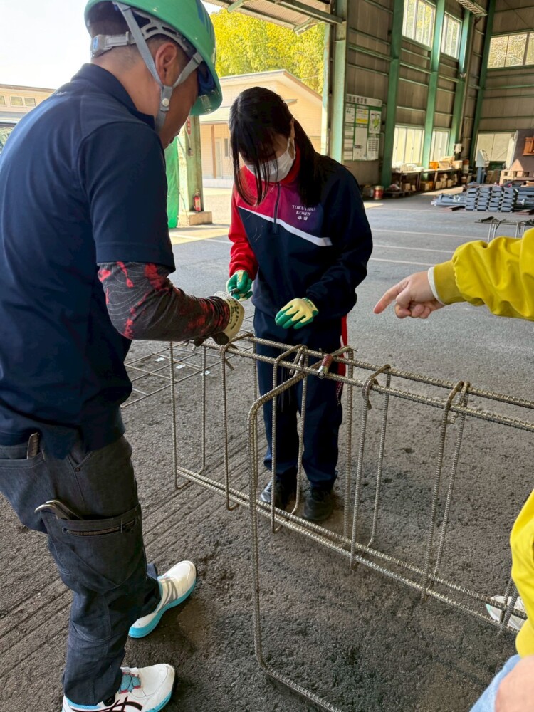 その後、鉄筋の話として弊社の工事風景などの動画を見ていただき、実際に体験をしていただきました。
