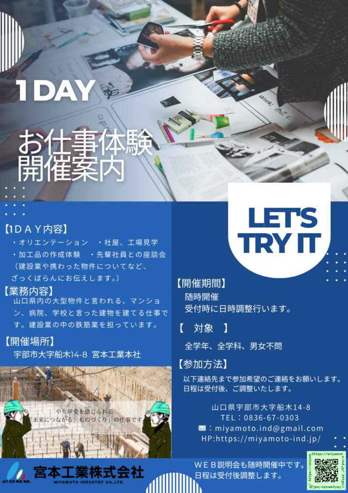 • 2025県内進学・就職魅力発信フェア への参加2025県内進学・就職魅力発信フェア への参加 2025年2月14日 維新大晃アリーナにて「県内進学・就職魅力発信フェアinやまぐち」に参加しました。 学校数18校、約1900名の参加でした。 沢山の生徒さんとお話することが出来て少しでも「鉄筋業」の事「宮本工業」の事を知っていただける機会になるなら嬉しいです。 宮本工業ではインターンシップのほか、職場見学、親子見学を随時行っています。 ご要 […]