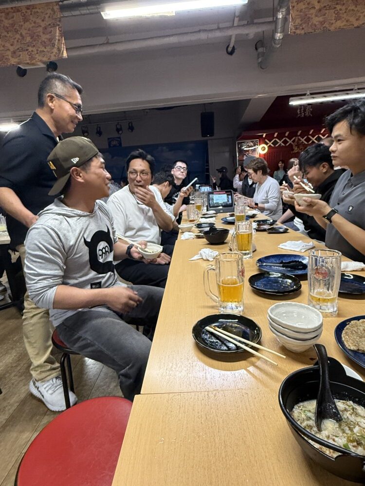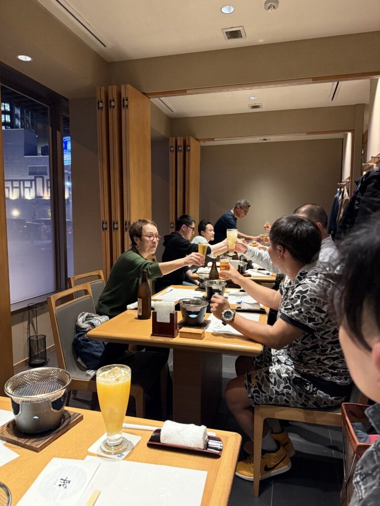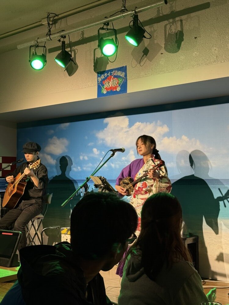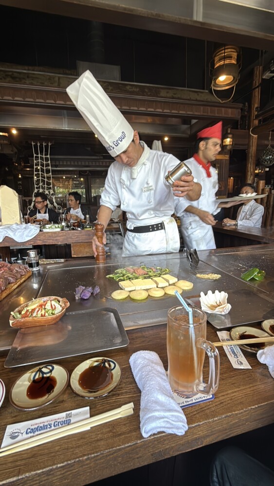 島唄を聴かせてくれる、唯歌ではお酒も進み、懐石料理では和牛のしゃぶしゃぶに実習生はどうやって作るのか興味深々。最後にキャプテンズインでは、鉄板焼きでのパフォーマンスを楽しみながらステーキを堪能。