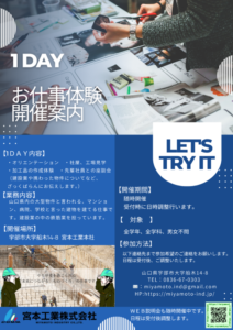 2日間のインターンシップに宇部工業高等学校と宇部フロンティア大学の生徒さんが来社されました。 今回は2日間と時間があるので、自分で加工したものを組み立てる作業までをやっていただきました。 作業する中で、先輩職人にも色々聞きながら作業が出来た […]